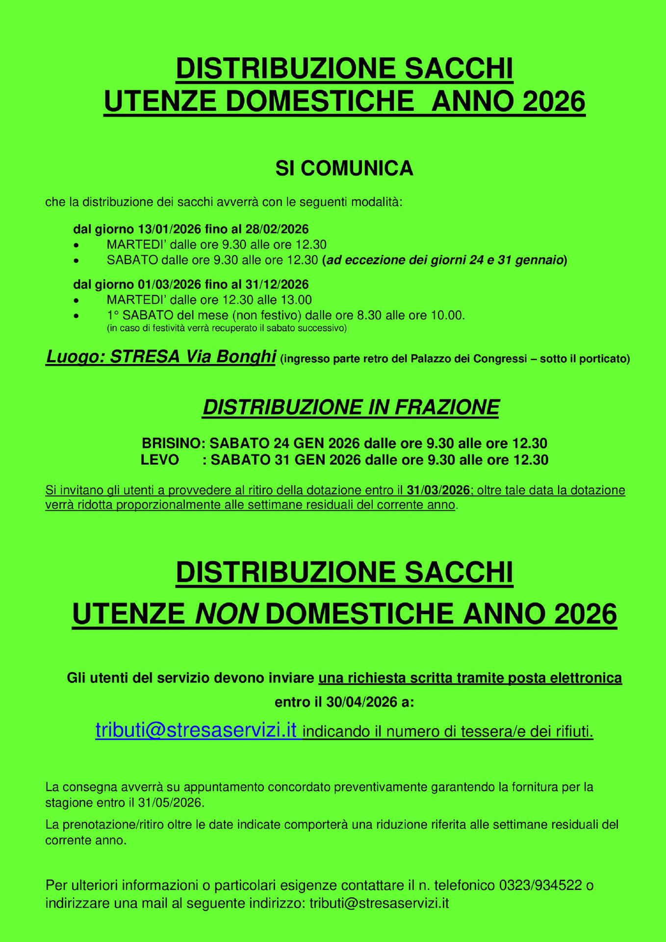 Si comunica che la distribuzione dei sacchi per la raccolta differenziata dei rifiuti per l'anno 2026, avverrà come da calendario allegato